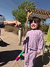 Paloma Sisson, 2陆, caught a trout using Green PowerBait on her Barbie fishing rod at Tingley Beach during her first fishing trip on March 29.